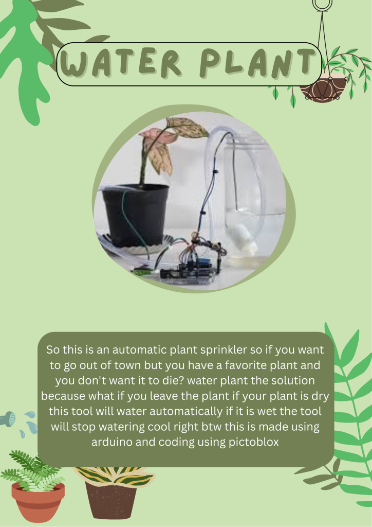 Halo guys so this is my LAST PROJECT in IT lesson the material is water plant ok so water plant is my project i make with my friend rajjah,ahmad,jubair So this is an automatic plant sprinkler so if you want to go out of town but you have a favorite plant and you don’t want it to die? water plant the solution because what if you leave the plant if your plant is dry this tool will water automatically if it is wet the tool will stop watering cool right btw this is made using arduino and coding using pictoblox